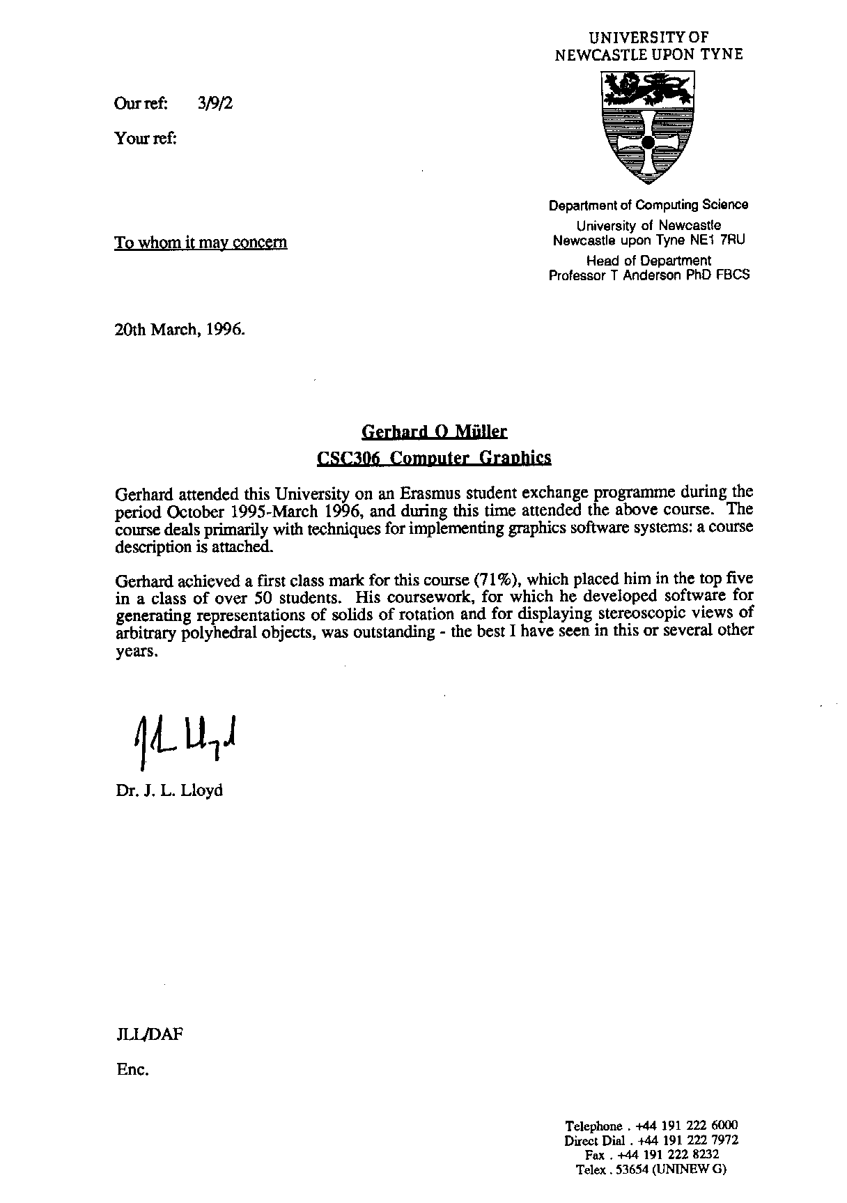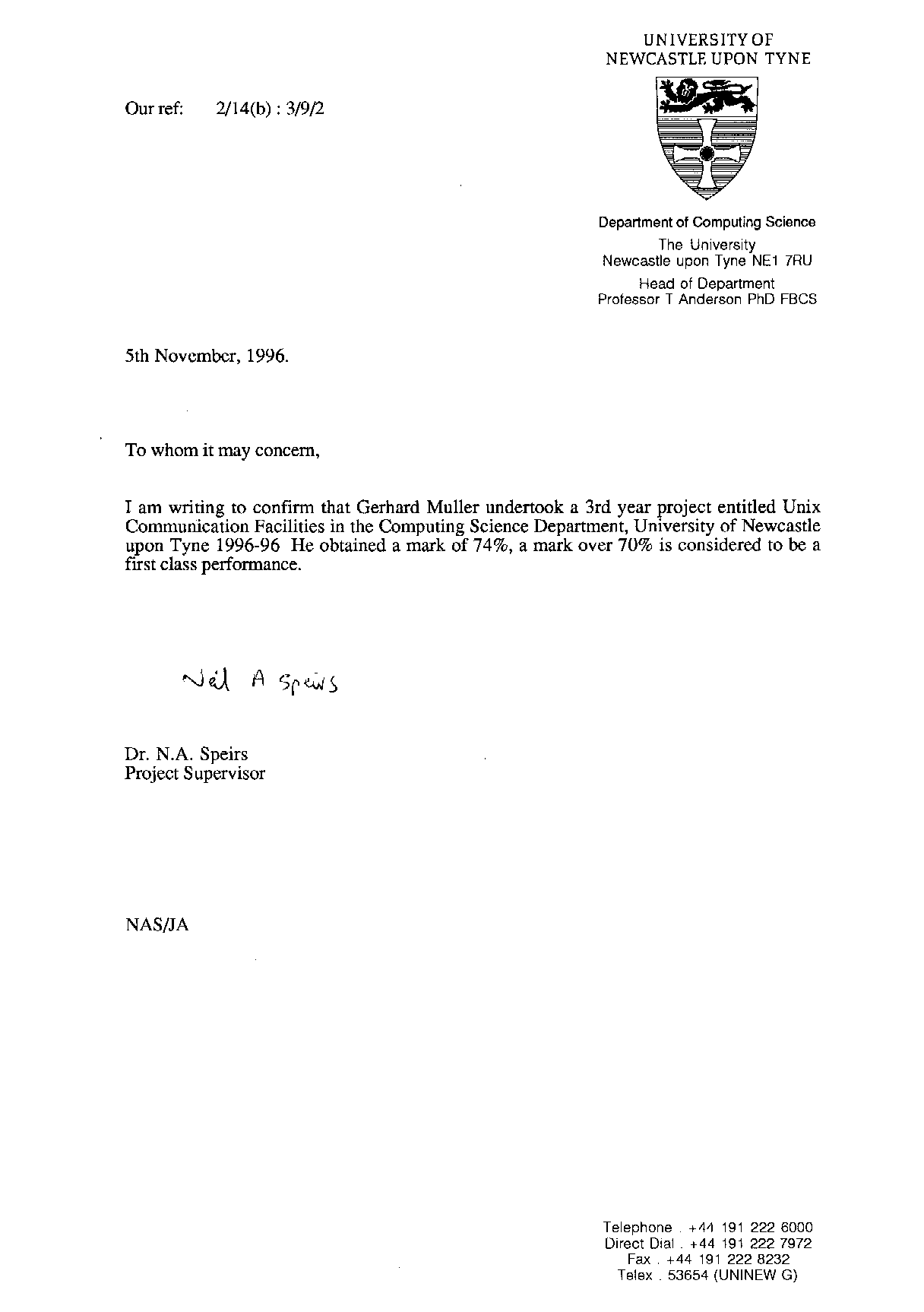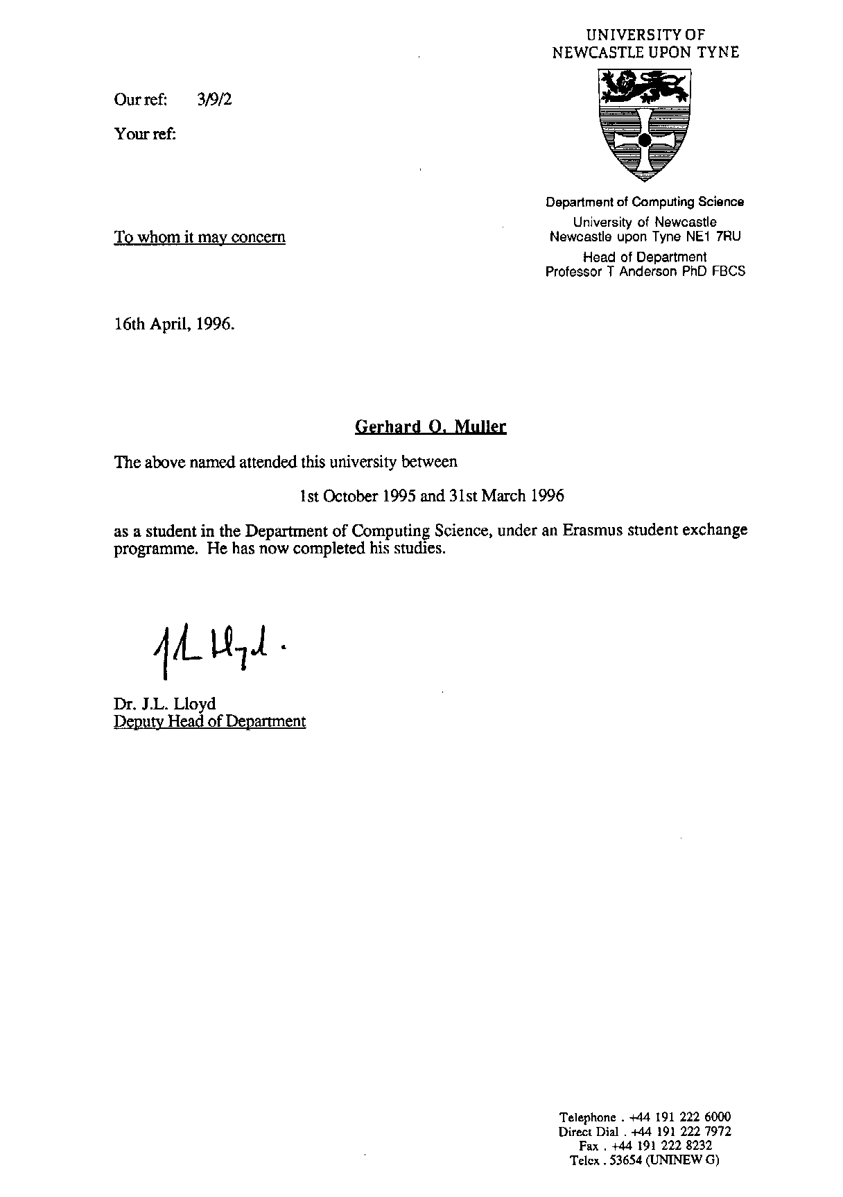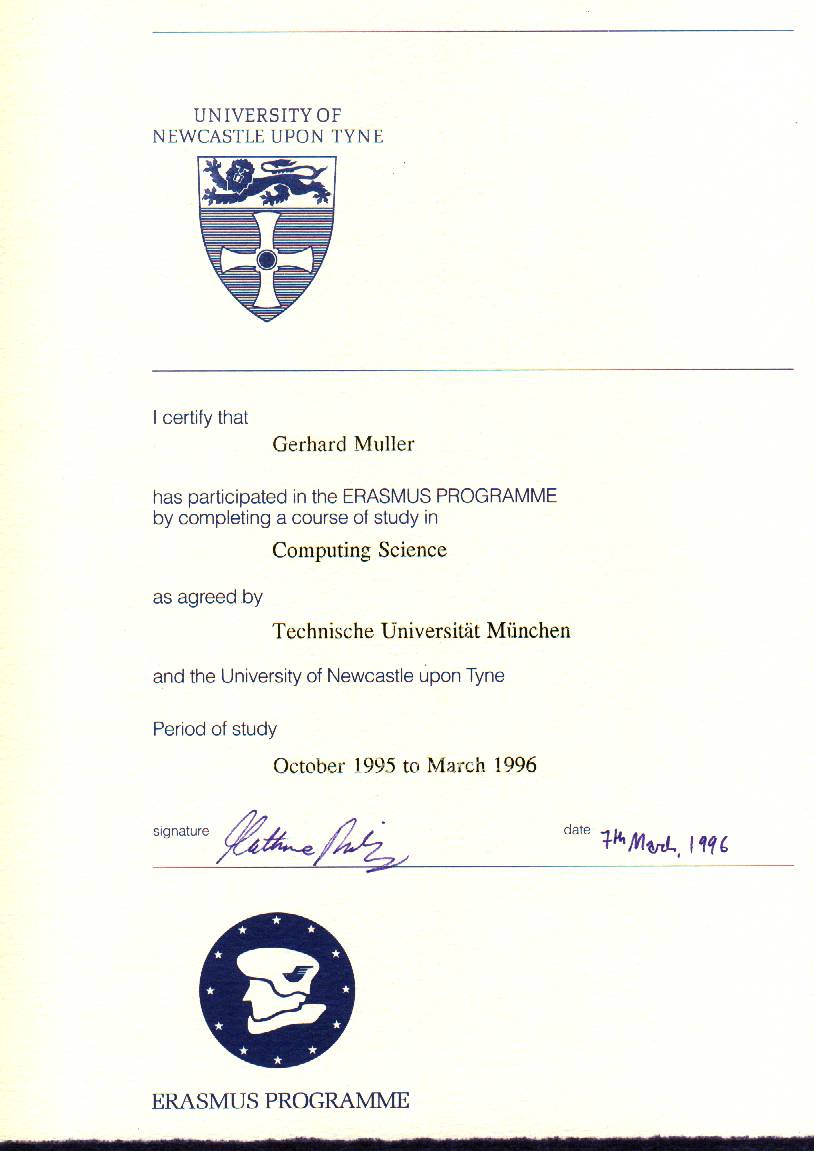 Ich habe zwischen 1. Oktober 1995 und 31. März 1996 in Newcastle upon Tyne, England, studiert.
